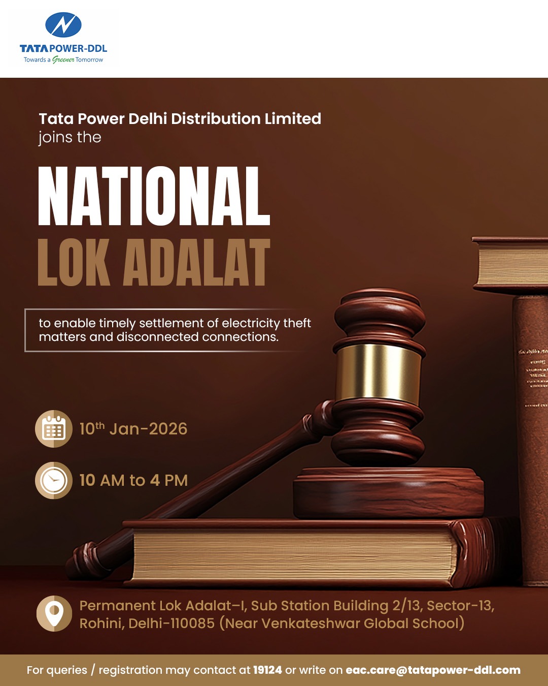 Tata Power Delhi Distribution Limited (Tata Power-DDL), a leading power utility supplying electricity to a populace of 9 million in North Delhi, will participate in a National Lok Adalat for on-spot settlement of electricity theft and disconnected connections cases. The National Lok Adalat will be held in association with Delhi State Legal Service Authority (DSLSA) on Saturday, 10th January, 2026 from 10:00 AM to 4:00 PM at PLA-1, Sub-station Building 2/13, Sector -13, Rohini, Delhi – 110085, near Vekateshwar Global School.